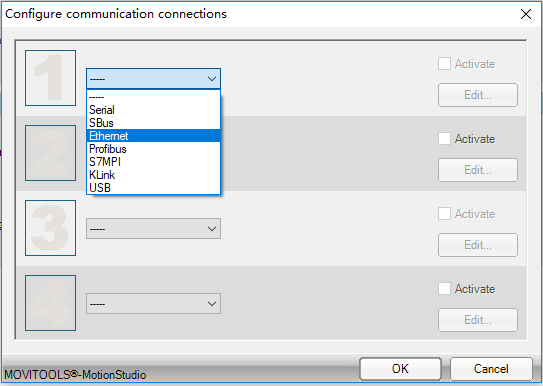 在第一个连接中,点击列表框,可以看到Motion Studio支持的所有通信接口,比如:Serial(串口)、Profibus等。本文介绍的是以太网接口,所以选择【Ethernet(以太网)】,如下图: