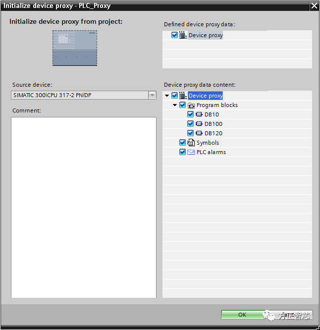 这时,新的PLC设备代理会添加到当前项目中,选中该代理设备,右键,选择“Initialize device proxy”(初始化设备代理)