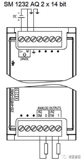 SM1232有两种类型:二通道型(SM 1232 AQ 2x14 bit)和四通道型(SM 1232 AQ 4x14 bit)。以“SM 1232 AQ 2x14 bit”为例:名称中的 “AQ”表示“模拟量输出(Analog Output)”,“2”表示有两个通道,“14bit”表示分辨率。我们知道,CPU不能直接处理模拟量信号,所以我们使用模拟量输入模块(Analog input module)把模拟量信号转换成数字量信号,这种转换称为模数转换(参考:《模拟量信号能被CPU直接处理吗?》);同样的,CPU产生的数字量信号也需要转换成模拟量才能控制执行机构,这种转换是从数字量转换成模拟量,所以称为数模转换(D/A转换)。SM1232就是一种把数字量转换成模拟量的模块,二通道型模块的外观如下图: