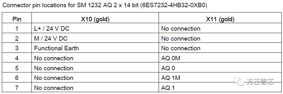 二通道型的SM1232模块有上下两排端子,上面是X10,下面是X11。X10的1号针脚接(+)24V,2号接(-)24V,3号接地,4-7号未使用;X11的1-3号针脚未使用,4号和5号一组,为通道0,4号接模拟量输出的负极,5号接模拟量输出的正极;6号和7号针脚一组,为通道1,6号接模拟量输出的负极,7号接模拟量输出的正极。端子定义及接线总览图如下: