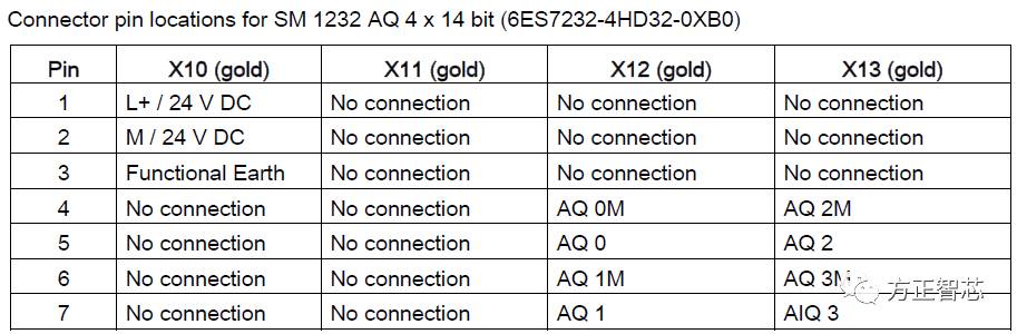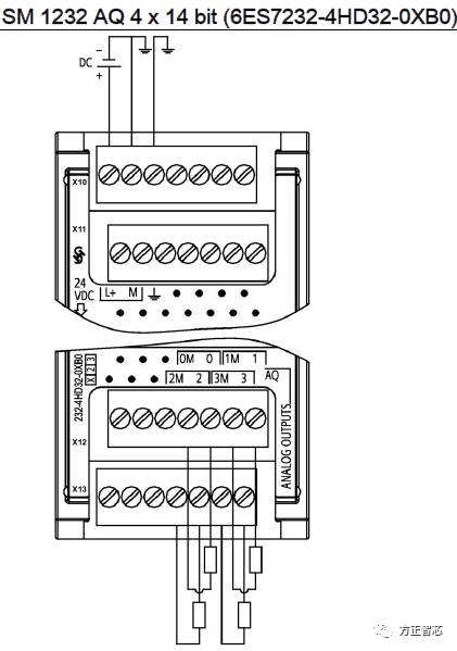 四通道型的SM1232模块有四排端子,从上到下依次是X10,X11,X12和X13。其中X10的1号针脚接(+)24V,2号接(-)24V,3号接地;X12的4号和5号针脚一组,为通道0,4号接模拟量输出的负极,5号接模拟量输出的正极;6号和7号针脚一组,为通道1,6号接模拟量输出的负极,7号接模拟量输出的正极;X13的4号和5号针脚一组,为通道2,4号接模拟量输出的负极,5号接模拟量输出的正极;6号和7号针脚一组,为通道3,6号接模拟量输出的负极,7号接模拟量输出的正极;其它针脚均未用到。端子定义及接线总览图如下: